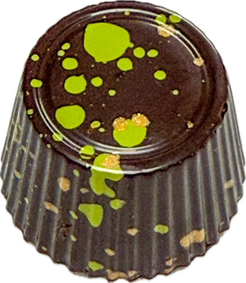 Chili crunch & Miso caramel layered ontop of a crunchy house made peanut praline. contains: dairy, nuts, & soy